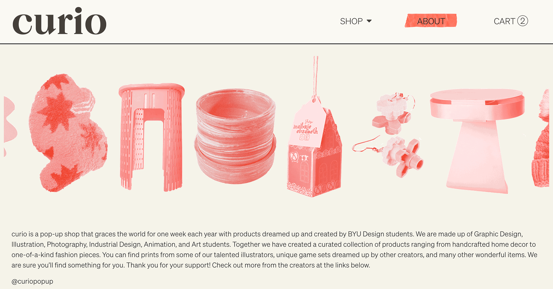 Curio is a collection of objects, dreamed up and handcrafted by the BYU Design Department Students. I had the opportunity to help out with branding, web and merch design, and also manage the Instagram account.