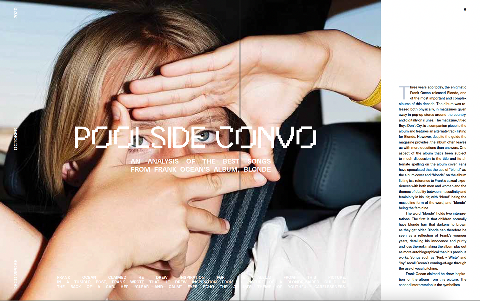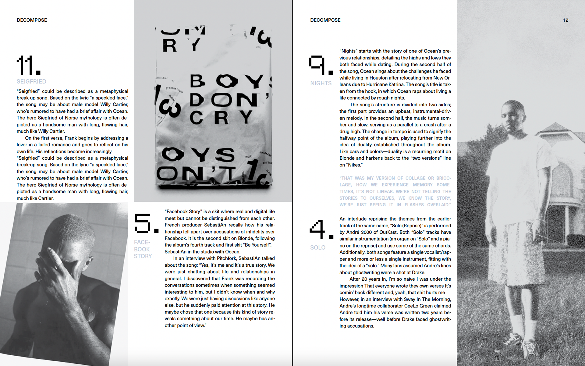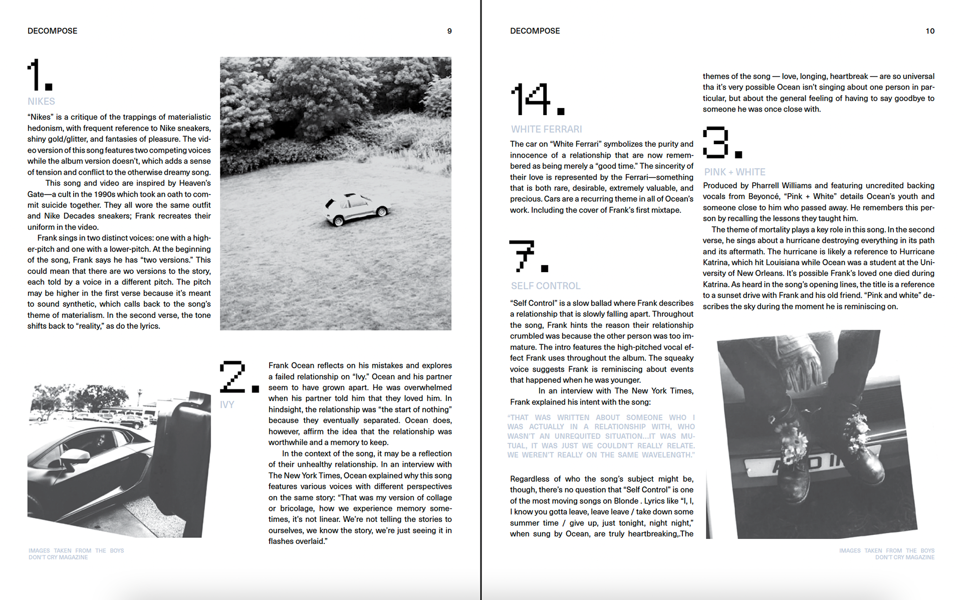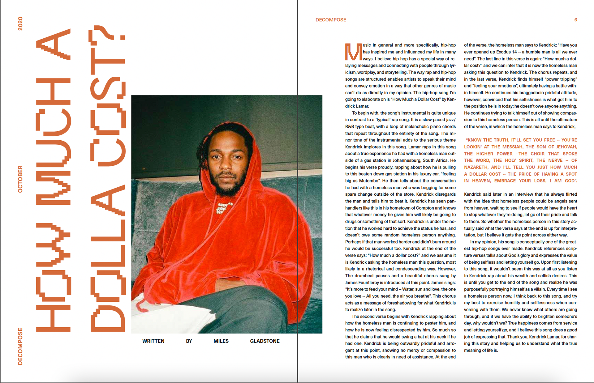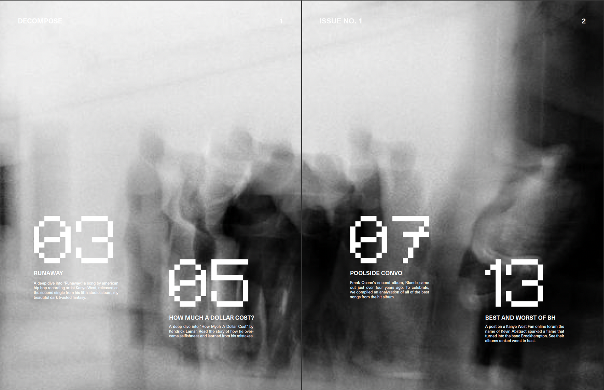 Inspired by Cole Kuchna's "Dissect Podcast", this magazine, Decompose, is a collection of analyses on popular Hip Hop and R and B music.